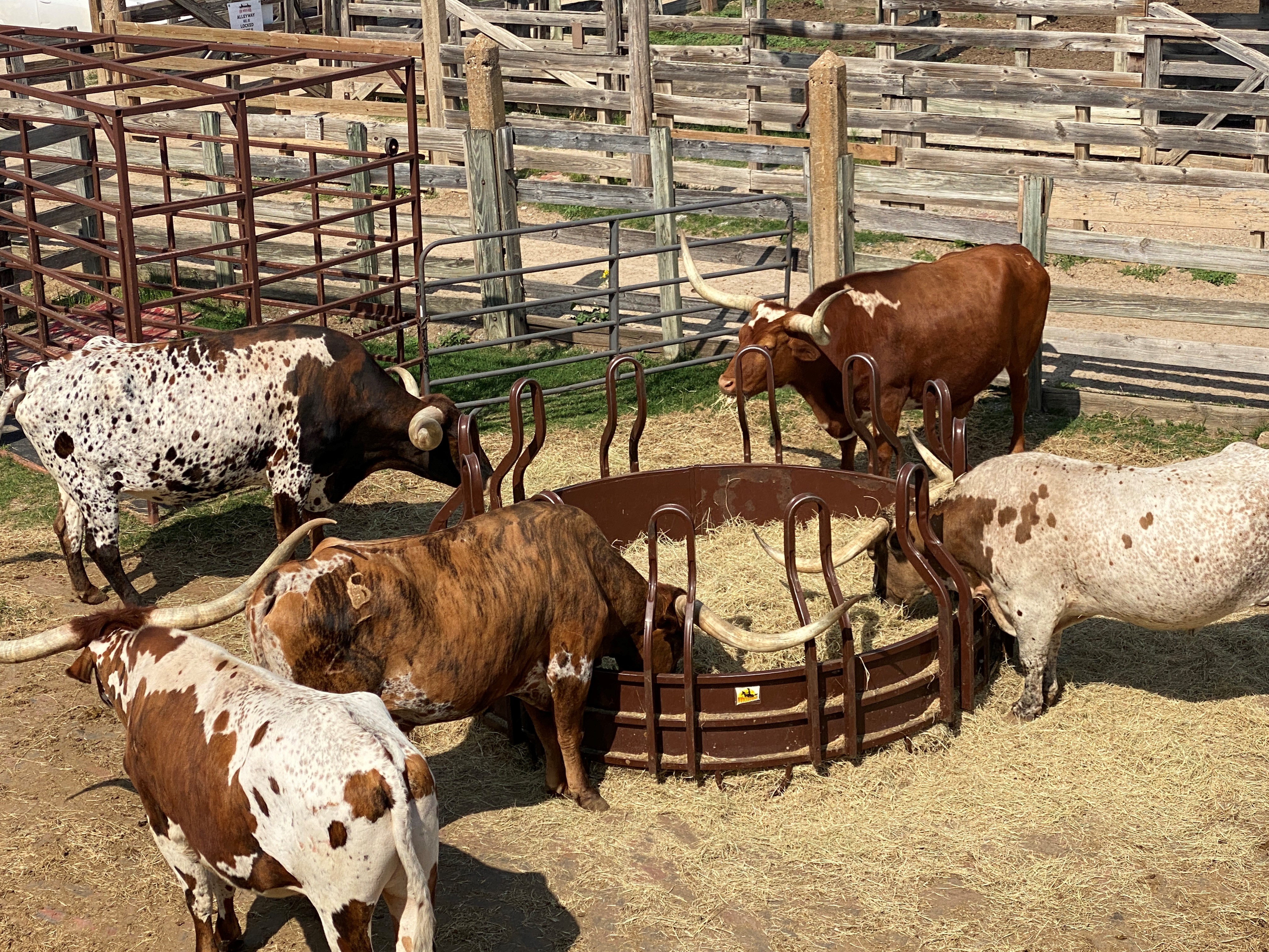 Texas longhorns (pictured on the stockyards of Fort Worth, TX) are a rare breed of cattle who were preserved from extinction in 1920 when some of the last remaining individuals were sent to Wichita Wildlife Refuge in Oklahoma. They have become well known for their unique appearance and gentle behavior.