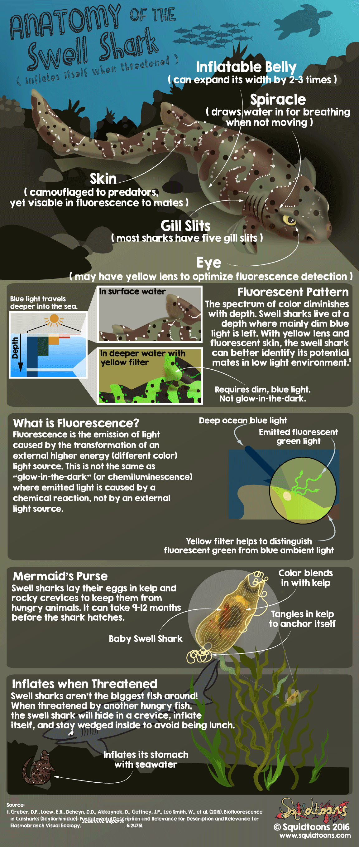 The swell shark (Cephaloscyllium ventriosum) is a fascinating fish that can be found in tropical waters of the Eastern Pacific. This animal can double the size of its stomach by swallowing water when feeling threatened. They are also biofluorescent, allowing mates and conspecifics to be able to find each other.