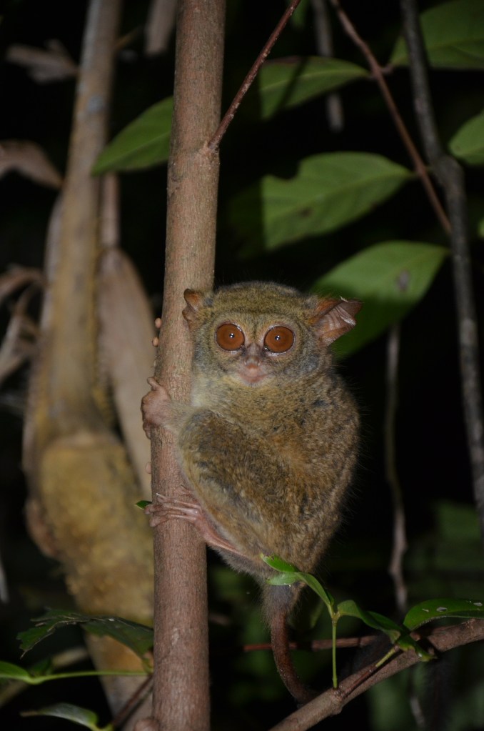 As you trek through the dark, damp foliage of the Indonesian nighttime, something is watching you. You can’t hear it over the whir and hum of nocturnal insects, but it can certainly hear you. It moves silently through the tree branches above you, hunting. Unbeknownst to you, its keen eyes lock onto its prey – dinner. With unnerving speed and accuracy, it pounces, landing on a thin vertical tree trunk just a few meters from you. Startled by the sound, you redirect the weak beam of your flashlight, and you finally get a good look at the predator and its unfortunate prey. The first thing you notice are the eyes – two bulging, eerie globes set in a minute face. Above the eyes are two leathery, ridged ears that are in constant motion, pivoting and twitching to attend to every strange sound the forest produces. A tail twice as long as the animal’s fist-sized body nearly brushes the forest floor. Thin, bony fingers grasp an unlucky katydid, which is quickly dispatched with several bites from needle-like teeth. You breathe a sigh of relief that you’re much too large to be on the menu for this carnivore. What you’ve just witnessed is a successful hunt by one of the world’s most unique primates – Gursky’s spectral tarsier (Tarsius spectrumgurskyae).