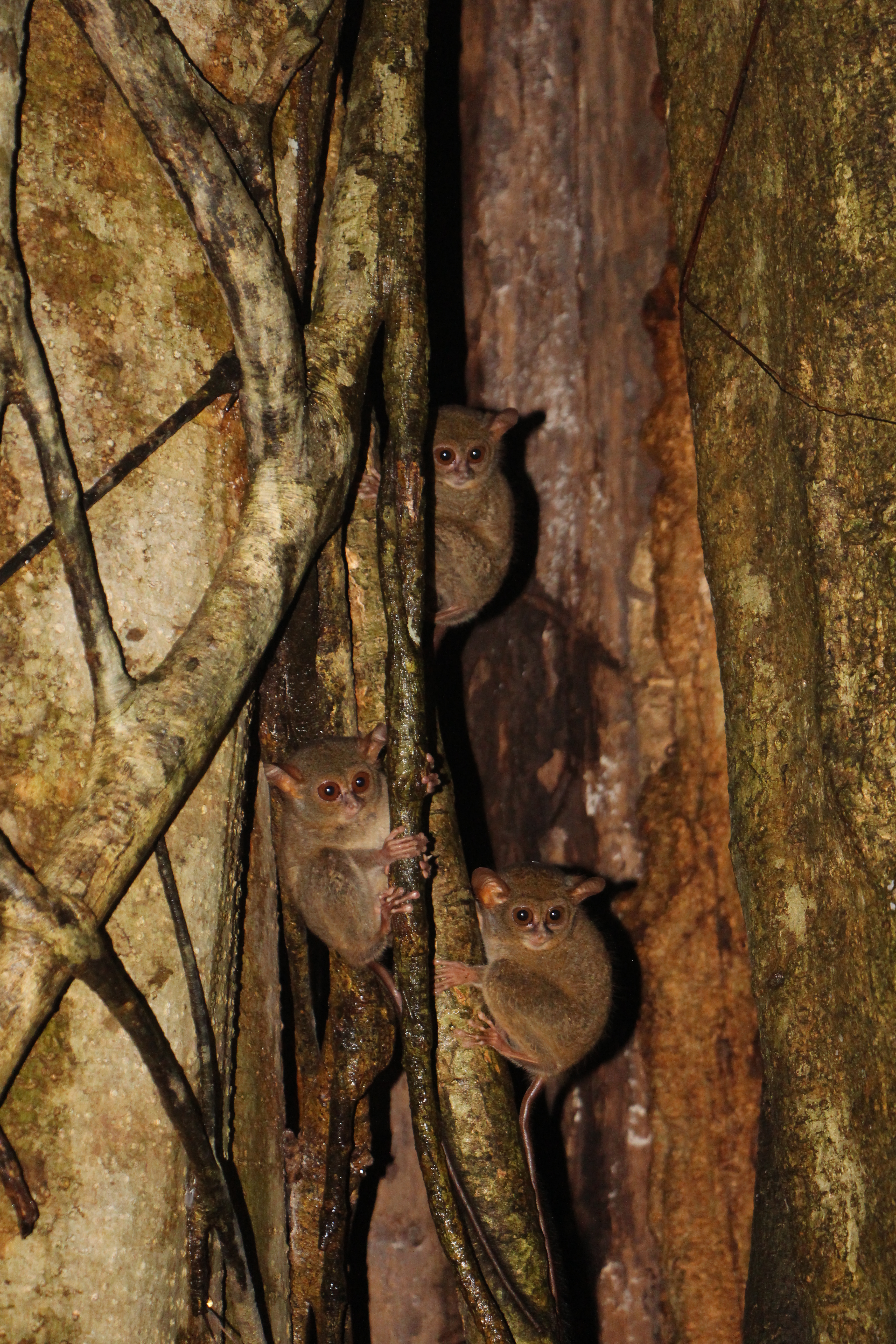 Found only on the tip of the northeastern arm of the Indonesian island of Sulawesi, Gursky’s spectral tarsier (Tarsius spectrumgurskyae) is just one of over a dozen species of tarsier scattered across Southeast Asia [1]. These small, rather peculiar-looking primates have the largest eye to body size ratio of all mammals. Each eye is larger than a tarsier’s own brain, resulting in a Yoda-like appearance [2]. Notably, however, their eyes lack a tapetum lucidum – the reflective structure that helps animals see in the dark and gives your cat’s eyes their eerie glow – making them difficult to locate by flashlight. Tarsiers make up for this with their enormous eyes and specialized brains, which allow them to see with very little light [3]. Wiry fingers and toes help tarsiers grip onto tree trunks and branches, and their long ankle bones (also called tarsi – the inspiration for their name) enable them to leap long distances from tree to tree [3].