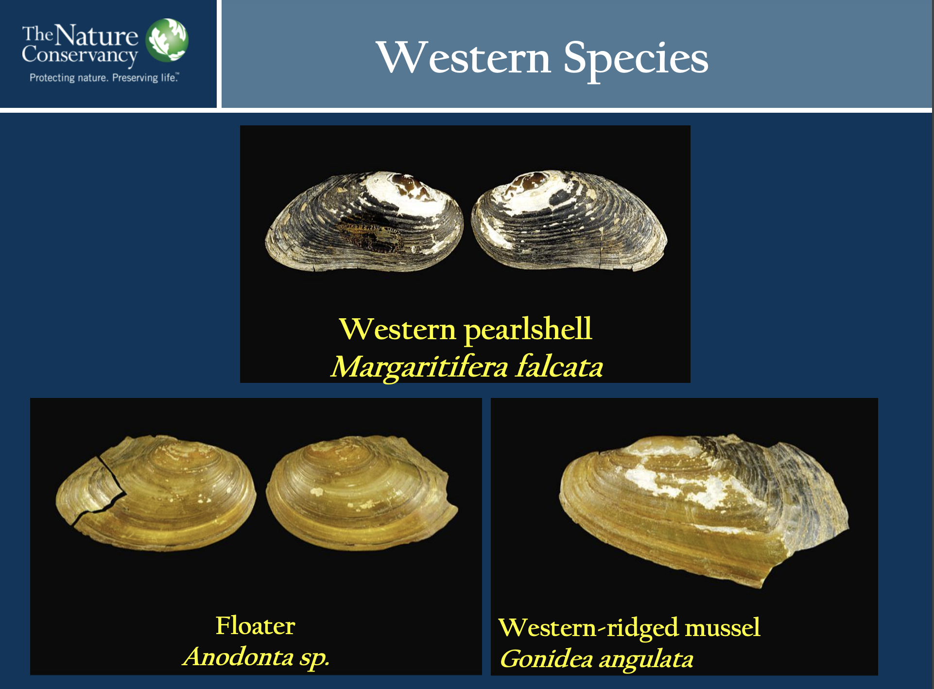 In California there are four species of native freshwater mussel: the Western Ridged Mussel (Gonidea angulata), the California Floater (Anodonta californiensis), Western Pearlshell (Margaritifera falcata), and the potentially the Oregon Floater (Anodonta oregonensis) that are in need of more research to support conservation efforts. But what’s so special about these often overlooked organisms, is it so important to lend them a hand—or, in this case, a foot?