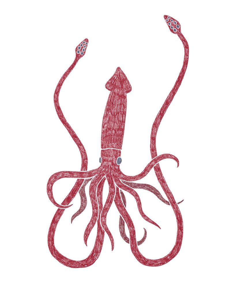 The giant squid (Architeuthis dux) is one of the world’s largest invertebrates. Not much is known about their behavior, which may contribute to their mysterious and mythical reputation. As deep sea predators, they hunt and capture prey with their two long feeding arms, each equipped with strong suckers. Like other squids and octopi, they produce a dark ink, which they use to defend themselves from predators like sperm whales.