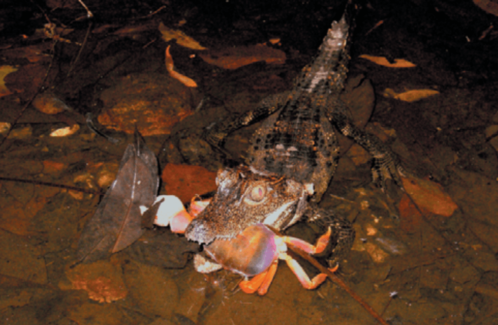 For that matter, it’s not known when or even how many times dwarf crocodiles nest during the year, though by talking with local hunters it seems that in some places they might have multiple clutches in a year [3]. Female dwarf crocodiles build mounds out of vegetation on which they lay their eggs. Each clutch has about a dozen eggs, and the mother sticks around to care for her hatchlings at least for a while. Like their breeding patterns, dwarf crocodile diets vary according to where exactly they live and the season. In general, they eat small animals like snails, crabs, insects, frogs, and fish, and rarely birds and small mammals [3]. Dwarf crocodiles are opportunistic predators and also feed on carrion, such as fish caught in fishermen’s nets.