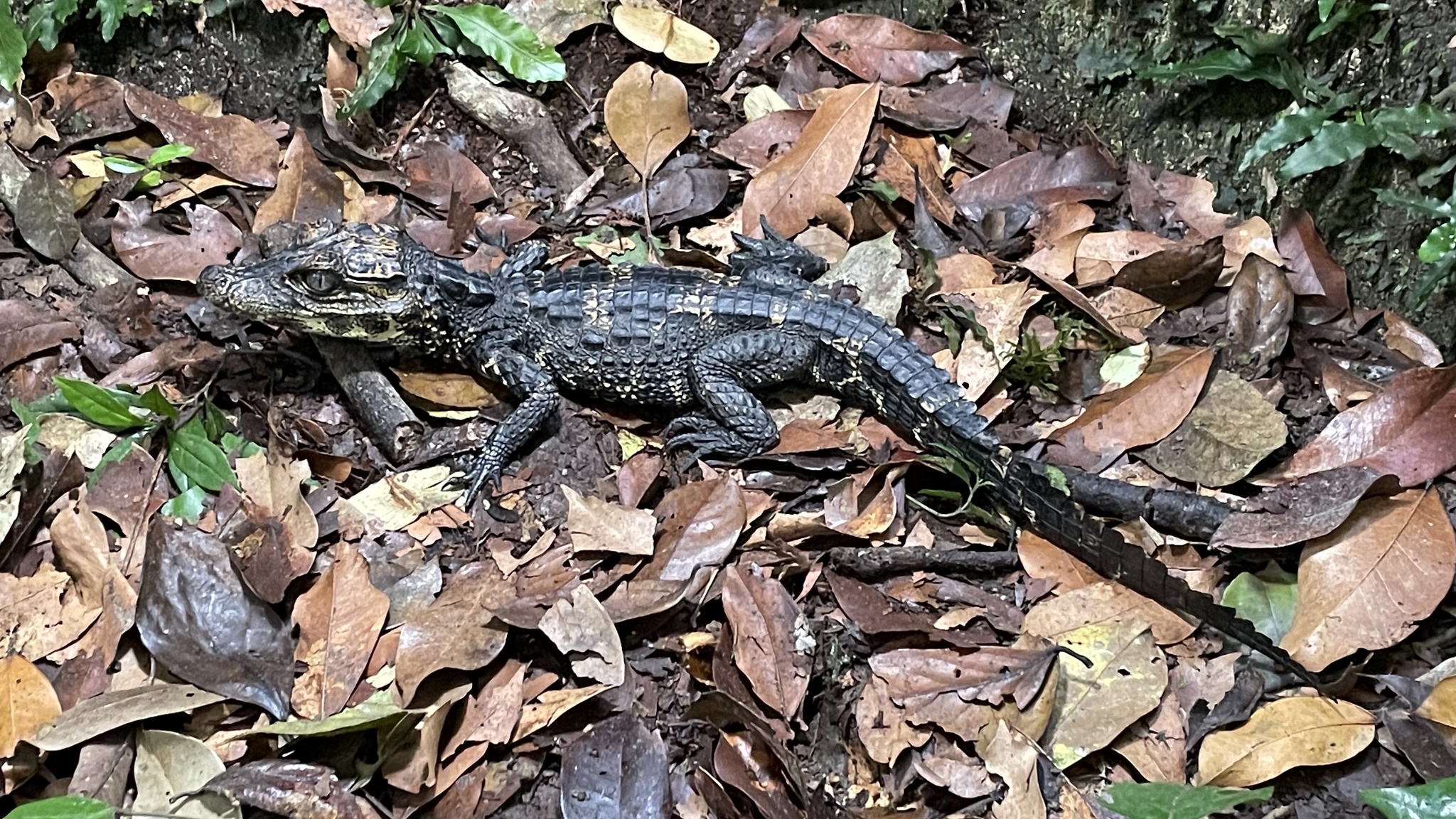 The African dwarf crocodile (genus Osteolaemus) weighs in at a scrawny 70 pounds and 5.5 feet long at most. They are darker gray in color than most crocodilians and have yellowish patches, which helps them blend into the canopy-covered rainforests of equatorial Africa from The Gambia through DRC where they live [3]. Unlike their 15-feet long/1,000-plus-pound better-known relatives, such as the saltwater crocodile and American alligator, dwarf crocodiles are nocturnal. They pass their days hidden in tangled root hideouts in swamps and forest pools or burrows [3].