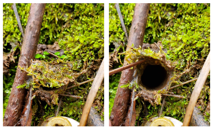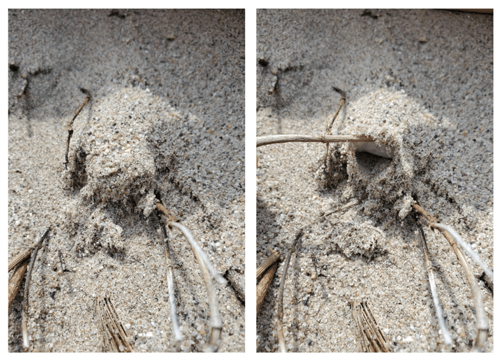 If a spider is feeling fancy, they might spruce up the door by incorporating nearby plant material, as seen above. While impressive, this behavior probably has more to do with blending in than displaying their keen design skills.