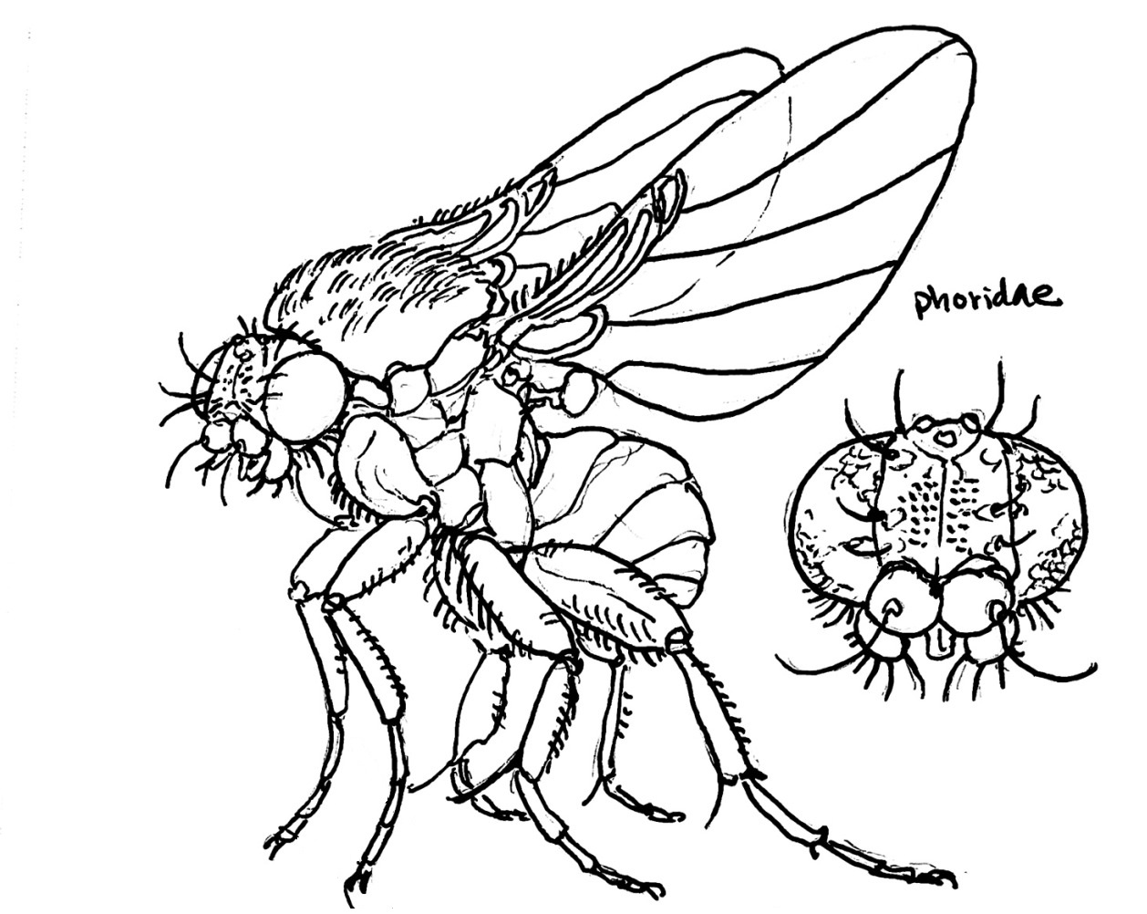 Phoridae is a family that contains insects, commonly known as coffin flies. They are referred to as ‘coffin flies’ due to their abundance in decaying corpses. Phorid flies are characteristically hump-backed in appearance and are known to run instead of fly.