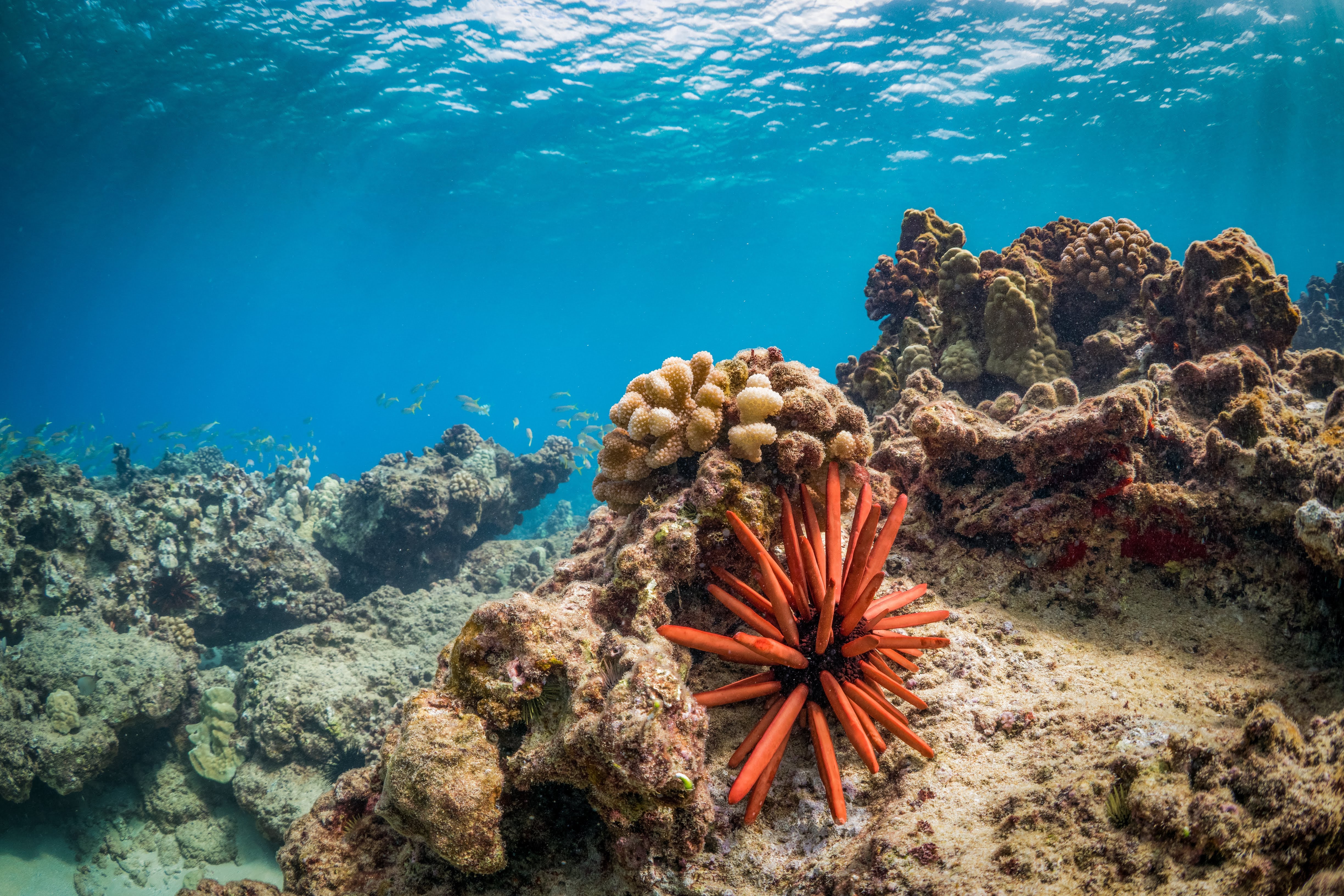 Below: Invertebrates like this bright red urchin (Heterocentrotus mamillatus) make up a substantial part of coral reef communities, yet they can be well-hidden and are often under-counted in traditional visual surveys. Using environmental DNA (eDNA) surveys of coral reefs—which involves collecting and sequencing genetic material shed by organisms into the water—allows the entire community to be detected from small samples of seawater from within the reef. Researchers at UC Mānoa combine eDNA with visual surveys to study community structuring, the effects of climate change, and the spread of invasive species on coral reefs.