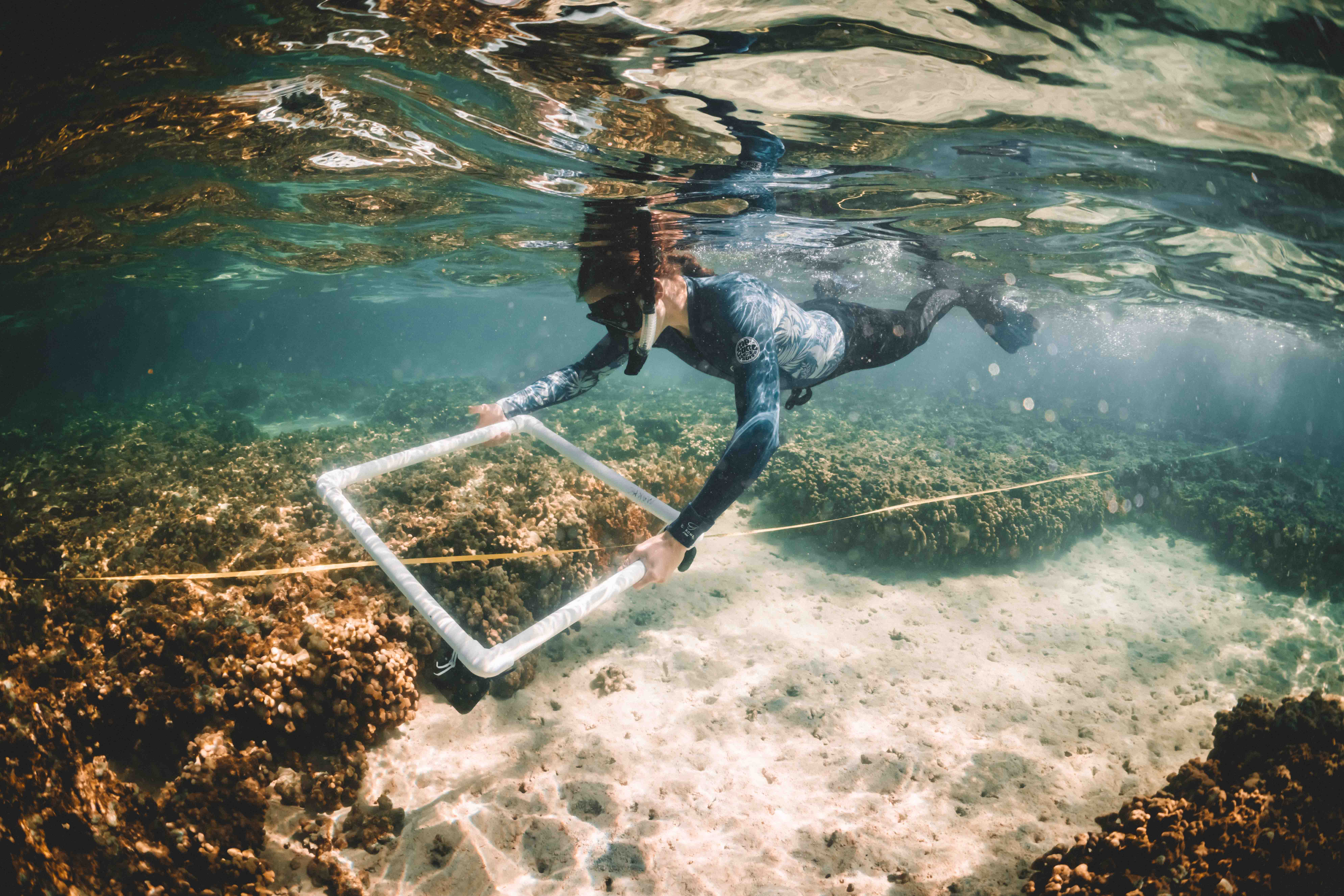 Tropical coral reef ecosystems are threatened by ocean warming, pollution, and other human impacts. To understand how reef ecosystems are changing, scientists survey the abundance and diversity of corals, fish, and other animals present. However, it can be very difficult to accurately count these creatures underwater! The photo above shows Cecile Vimond, graduate student at the University of Hawaiʻi at Mānoa, conducting a visual coral reef diversity survey in Kāneʻohe Bay. To do so, she uses a transect (the measuring tape) and quadrat (the white PVC frame), which she will place on the bottom, then count and identify every organism inside.