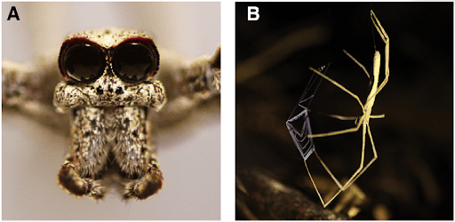 While waiting upside-down, ogre-faced spiders can strike forwards at walking prey or backwards at flying prey. Furthermore, while they need the night vision provided by their two big eyes for spotting food on the ground, they can catch flying prey while blind. Spiders don’t have ears like us, but they have slits and hairs on their arms that can detect vibrations, and some like ogre-faced spiders evidently have complex neural circuitry that can transform those tiny vibrations from wing flapping into the position of their next meal. So, should you be scared of ogre-faced spiders? Unless you are a small flying insect in a tropical forest, I’d say no. Plus, their gigantic eyes make them far cuter than any ogre I have ever seen!