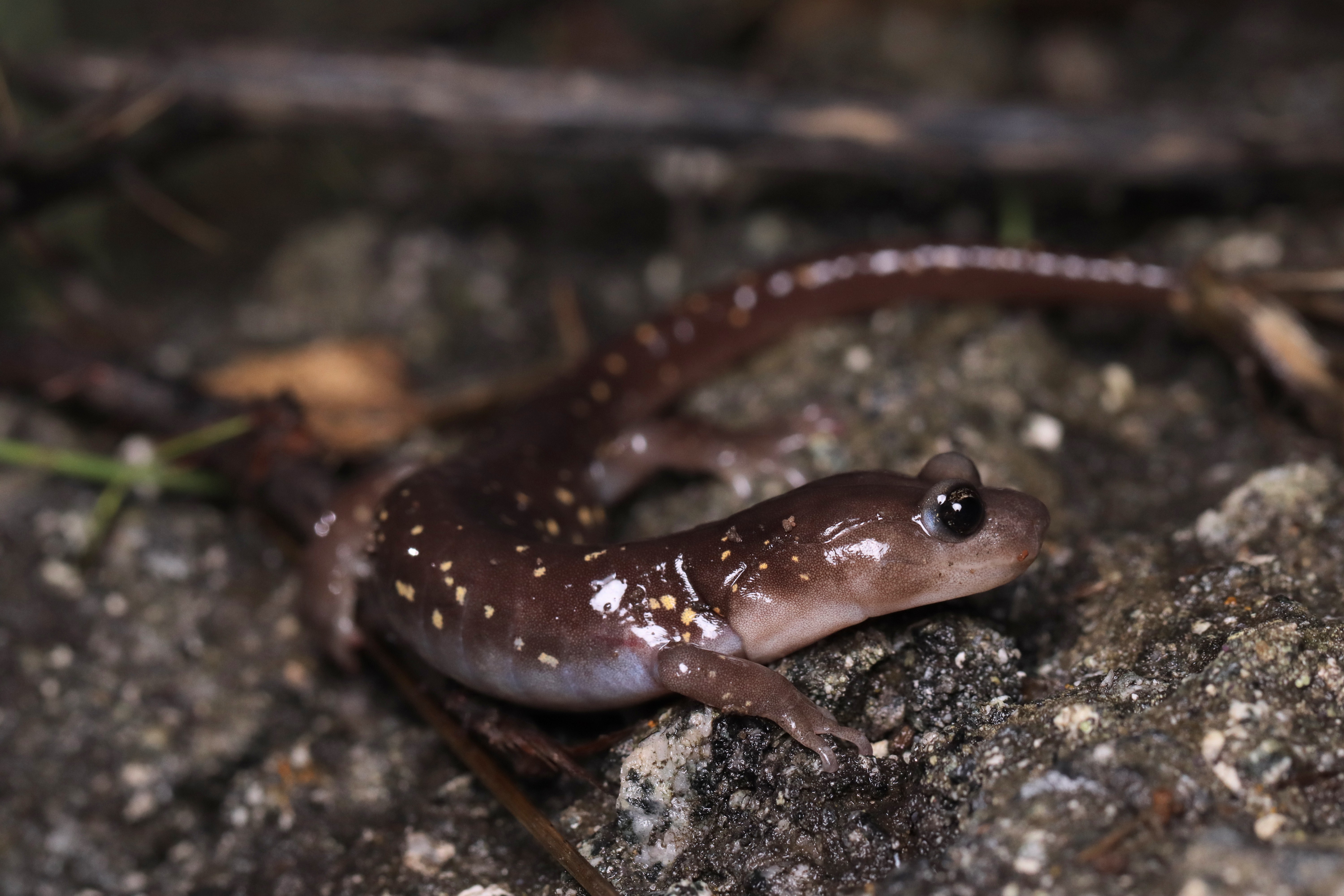 The next salamander I encounter has the same color pattern of brown on top and orange below. This fools many people into thinking it is the same as the newt I have just described. More importantly, it fools potential predators into thinking the same thing. The smooth skin and a point of constriction at the base of the tail betrays the animal’s true identity as a Yellow-eyed Ensatina (Ensatina eschscholtzii xanthoptica). Although this species is known to be distasteful, it does not harbor the same deadly toxin of the newt. This salamander’s mimicry is enhanced by gold pigmentation in its eyes. We know this is not pure coincidence because Ensatina populations that don’t live alongside especially toxic newts have very different coloration and lack the yellow eyes that give this subspecies its name [2]. As I marvel at this damp little being and take photos, yet another salamander seemingly materializes before me. I initially missed this worm-like amphibian as, to the non-scrutinizing eye, its brown, elongated body appears just as another twig in the leaf litter. Tiny arms and legs propel the Gabilan Mountains Slender Salamander (Batrachoseps gavilanensis) over the soil under which it usually resides. Like all of the others, the rain has called this creature to the surface.