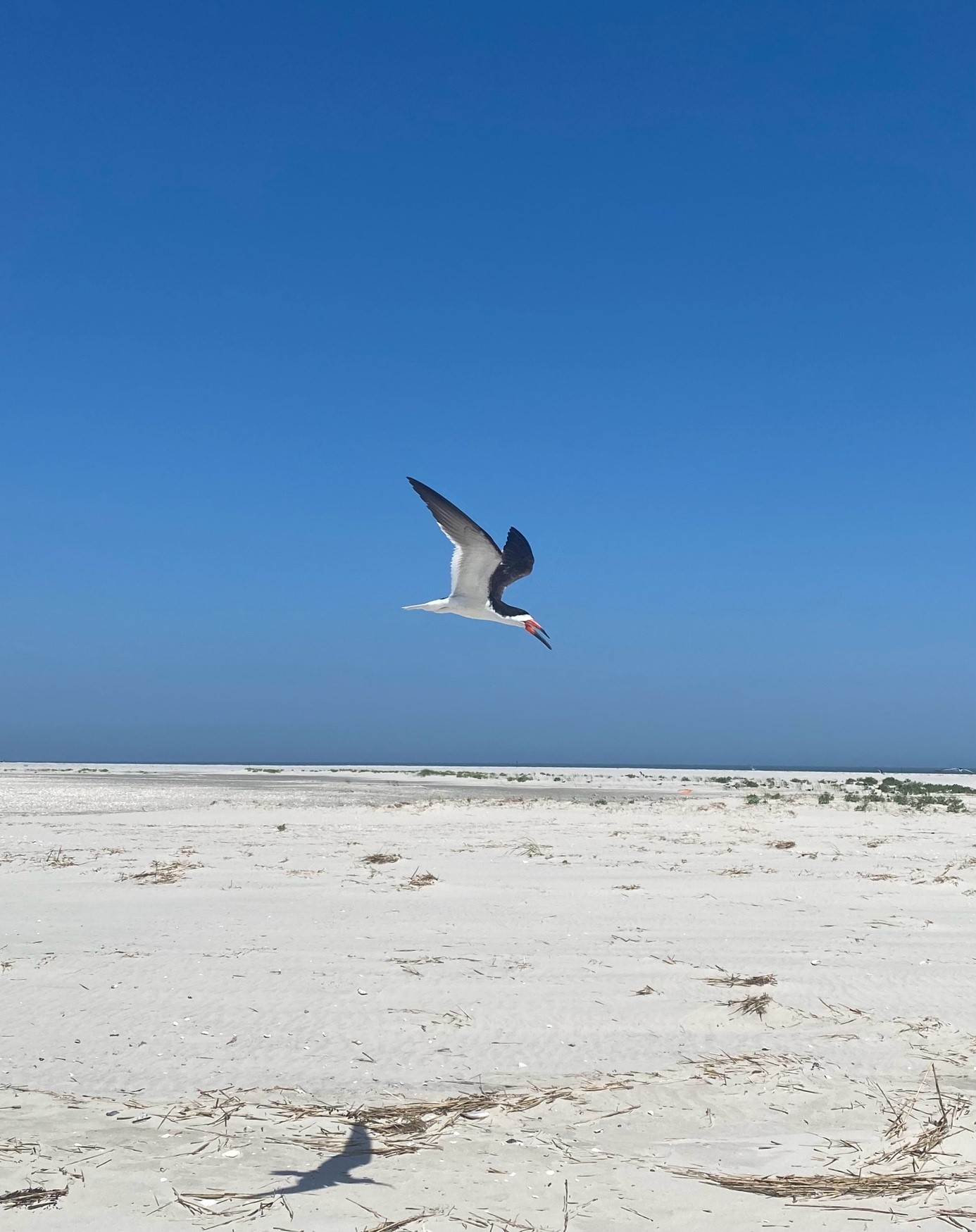 Still, I do love watching birds on this beach. I lift my binoculars to scan the sand, picking out tiny white shapes from the speckled gray background. Good – the Piping Plover chicks are still alive and well, bouncing along behind their mother like little cotton balls on toothpick legs. I continue along the beach, and the shrill cries and whirling white shapes above me tell me I’m approaching the tern colony. I give the nests a wide berth so as to not disturb them too much – adult terns will dive bomb intruders to protect their chicks. Mixed in among the terns are some of my favorite birds: Black Skimmers. Their ridiculously oversized lower bills look like they would weigh down their necks, but the adults still wheel and dive gracefully, skimming the water to snap up fish. The chicks are less graceful, and also remarkably un-skittish; I nearly trip over one as I turn to make my way back up the beach. Protecting these tiny, adorable, vulnerable young birds is an amazing feeling. But are the sunburns, gritty sand, threat of heat exhaustion, and interactions with drunk vacationers worth it? I’m not sure.