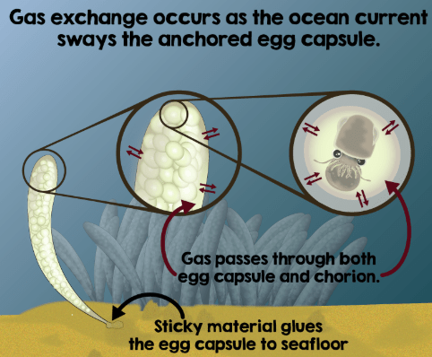 Market squid lay their eggs before the end of their lifespan, attaching them to the ocean floor. This anchoring exposes the eggs to ocean currents, facilitating gas exchange for the developing embryos. The embryos can tolerate stress caused by changes in oxygen concentration and pH.