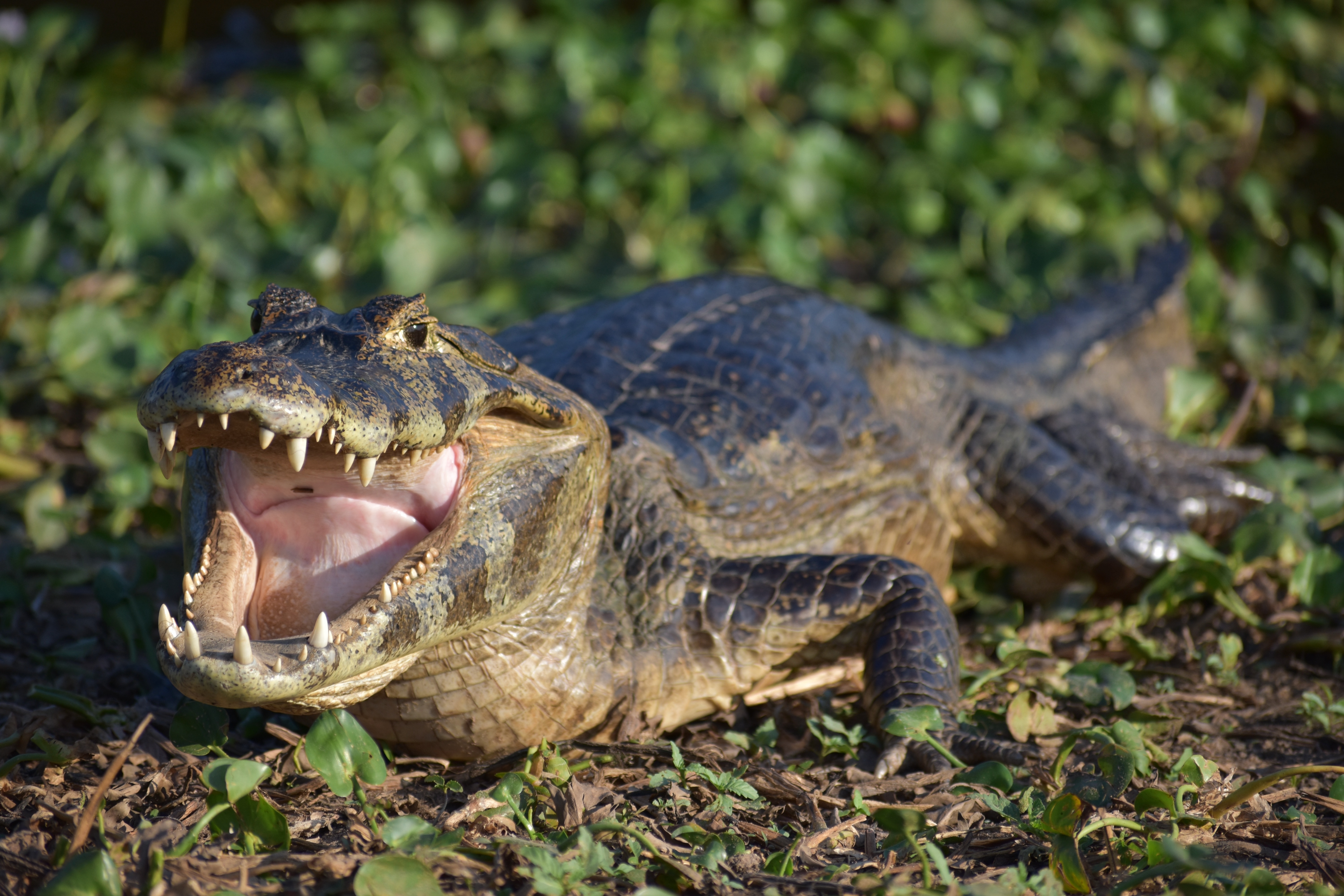 Many crocodilians (crocodiles, alligators, and caimans) in photos almost appear to be smiling wide. But make no mistake here, this Yacare Caiman (Caiman yacare) from Brazil may grow almost as long as 10 feet and probably does not want to be trifled with. The Yacare Caiman has a diet that begins with anything they can find underwater, including snails, fish, and sometimes even other caimans, but does not end there—they can also eat large terrestrial animals including Capybaras, which themselves can reach a few feet in size. Despite their fearsome status, some years ago the Yacare Caiman was almost hunted to extinction for the softer parts of its scaly skin that could be made into leather. Luckily, conservation action restricting hunting and selling has allowed local populations something of a return to form. We should try not to let our fear of these predators turn into disrespect—they just so happen to be extremely successful top predators, which many ecosystems need to keep the lower trophic levels in check. Besides, they don’t always sit at the top of the food chain. Juvenile Yacare Caimans, which lack parental care and are thus somewhat self-sufficient, often fall prey to large birds such as storks and herons that relentlessly stalk the tall grasses that the young caimans call home. Such is the food web.